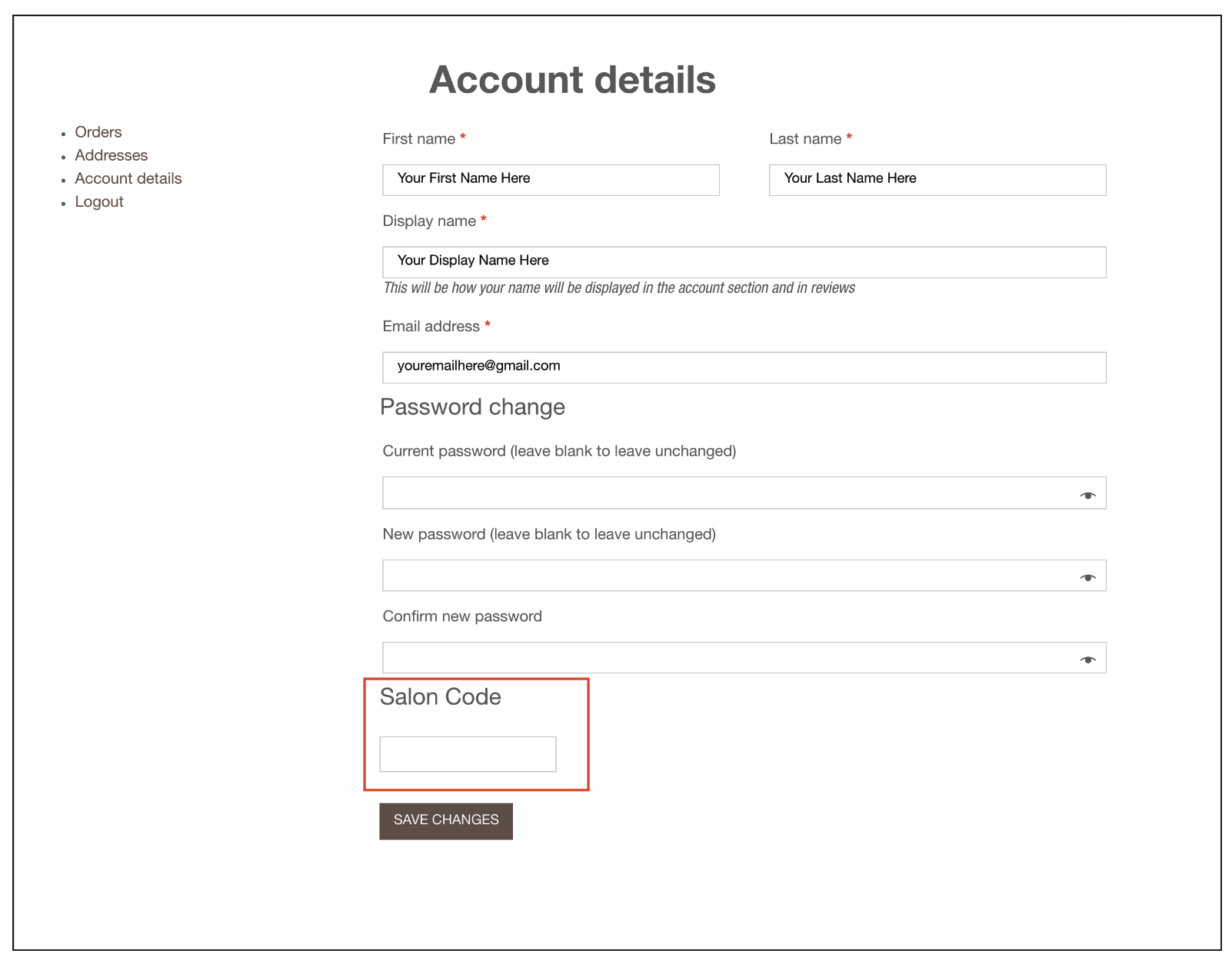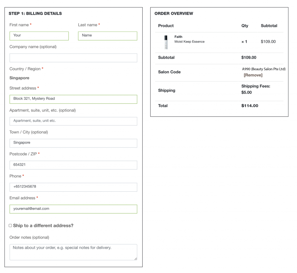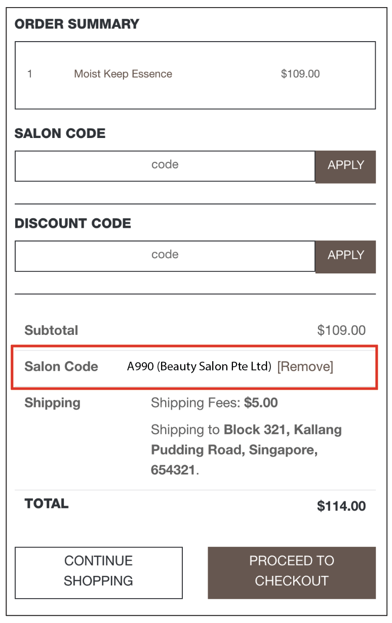 - Before proceeding to checkout, remember to check if you have key in your ‘Salon Code’ under the Account Details page.